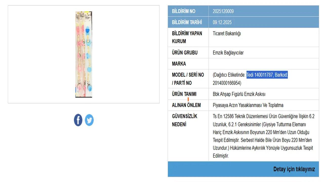 Piyasaya arzı yasaklanan bir diğer ürün ise bebek emzik askısı oldu. Askının uzunluğunun güvenlik limitlerini aşmasından ötürü bebeklerde “boğulma tehlikesine” yol açabileceği vurgulandı.