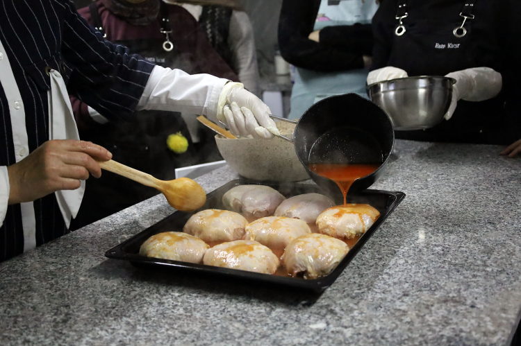 Atölyenin ilk gününde kursiyerler, eğitmenleri eşliğinde Topkapı Piliç, Portakalın Rüyası ve Tahinli Kabak Mezesi hazırladı. Hem teknik bilgi edinen hem de uygulamalı çalışma fırsatı bulan kursiyerler, keyifli bir başlangıç yaptı.