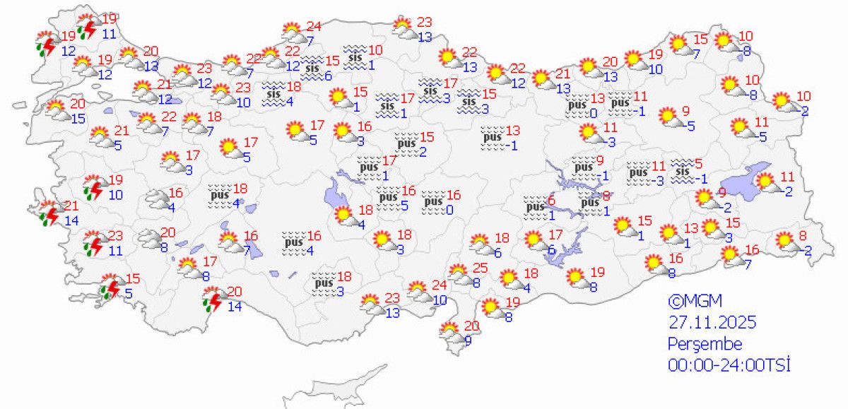 Cuma günü İstanbul, Kırklareli, Edirne, Tekirdağ, Çanakkale, Yalova, Bursa, Balıkesir, Manisa, İzmir, Kütahya, Afyonkarahisar, Uşak, Isparta, Antalya, Burdur, Denizli, Muğla ve Aydın illerinde gök gürültülü sağanak yağışlar bekleniyor.