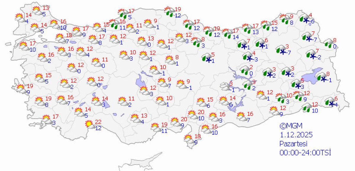 Güney ve batı bölgelerde güneşli aralıklar beklenirken, Karadeniz ve Doğu Anadolu’da yağmur ve kar yağışı ihtimali artıyor.