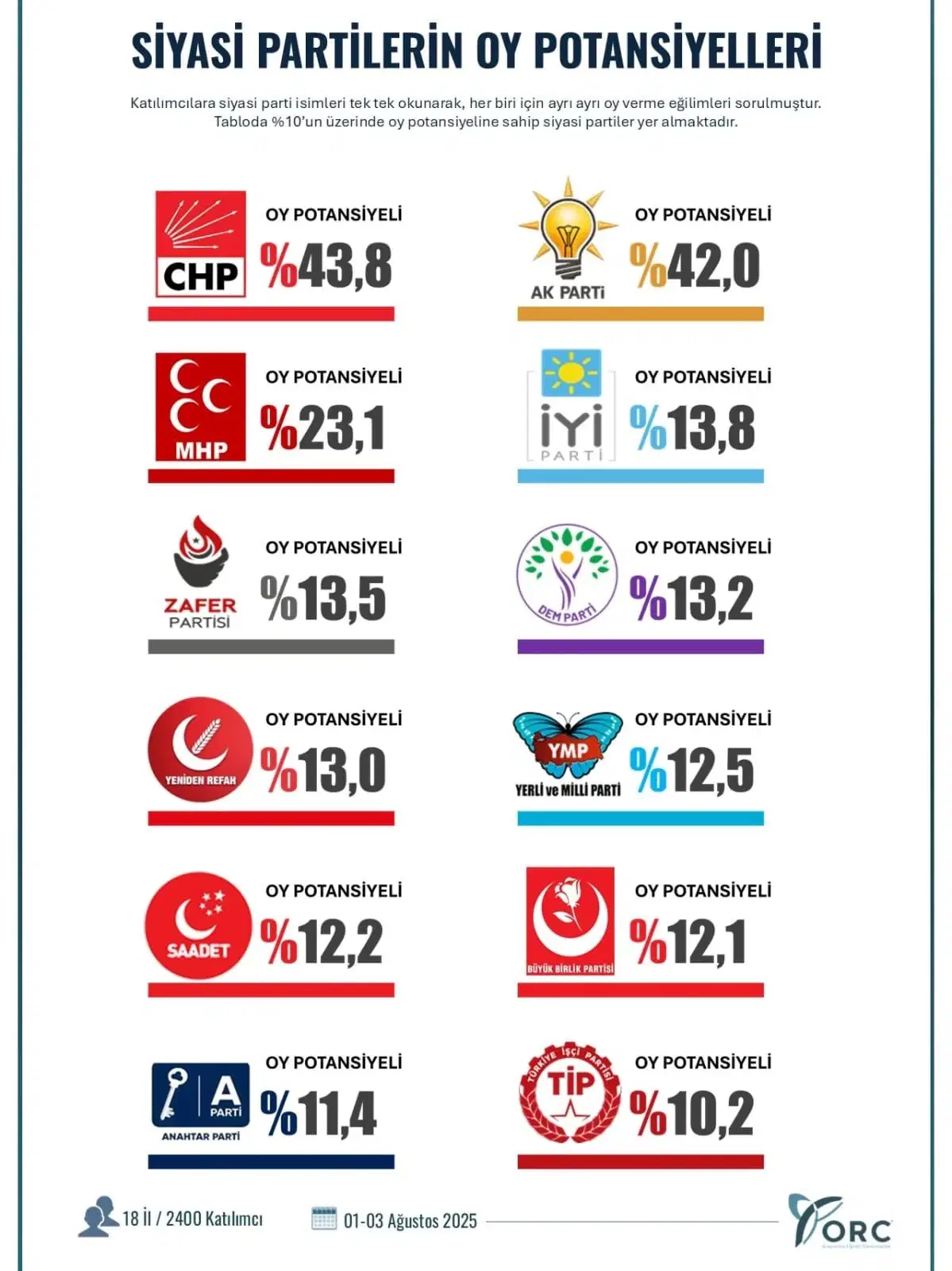 ORC Araştırma, 01-03 Ağustos 2025 tarihleri arasında 18 ilde 2400 katılımcıyla yaptığı seçim anketinde partilerin oy potansiyellerini ölçtü.