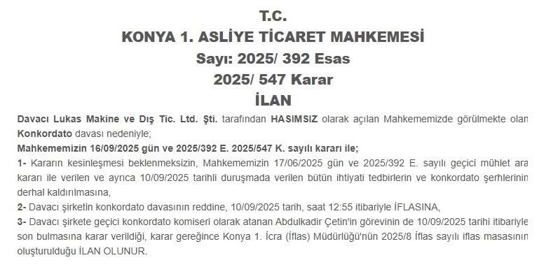 Konya 1. Asliye Ticaret Mahkemesi, 10 Eylül 2025’te saat 12:55’te firmanın iflasına hükmetti. Mahkeme kararıyla, geçici konkordato komiseri Abdulkadir Çetin’in görevi de sona erdi. Lukas Makine, konkordato süreciyle ayakta kalmaya çalışmıştı. Mahkeme, daha önce şirkete üç aylık geçici mühlet tanımış, ancak bu süre sonunda toparlanma sağlanamadı.